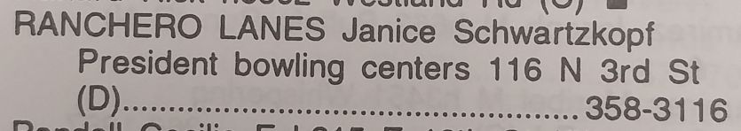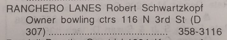 | Factoids: | Bob and Janice Schwartzkopf owned and managed Ranchero Lanes. |